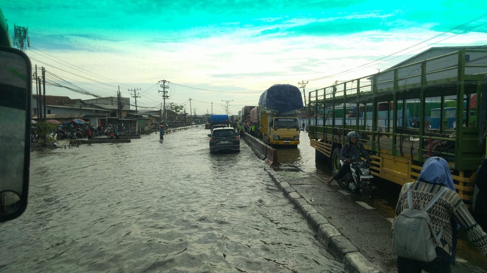 Truk-truk besar tampak berderet tanpa gerak. Beberapa sopir mematikan mesin, turun dari kabin, dan duduk bersandar di pinggir jalan, menatap genangan air yang tak kunjung surut.