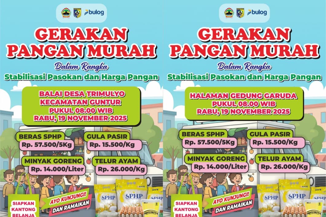 Demak - Gerakan Pangan Murah sebagai upaya menjaga stabilitas pasokan dan harga pangan bagi masyarakat. Kegiatan ini akan dilaksanakan serentak pada Rabu, 19 November 2025 mulai pukul 08.00 WIB di dua lokasi berbeda.