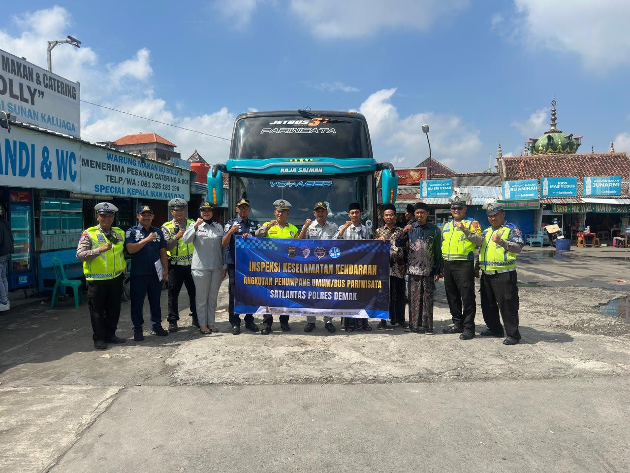 Demak - Mendukung pelaksanaan Operasi Keselamatan Candi 2026, Satuan Lalu Lintas (Satlantas) Polres Demak bersama Dinas Perhubungan serta Jasa Raharja menggelar inspeksi keselamatan berkendara. Sasaran inspeksi kendaraan angkutan wisata yang beroperasi di kawasan wisata religi Kadilangu, Rabu (11/2/2026).