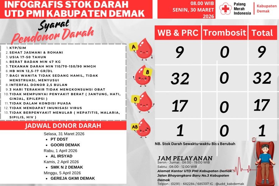 Demak - Ketersediaan stok darah di Unit Transfusi Darah (UTD) PMI Kabupaten Demak terpantau masih terbatas. Berdasarkan data terbaru per Senin, 30 Maret 2026 pukul 08.00 WIB, jumlah stok darah untuk semua golongan masih berada pada angka rendah.