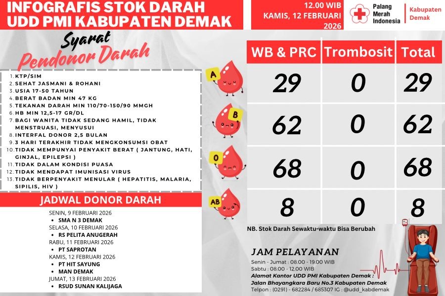 Demak - Unit Donor Darah (UDD) Palang Merah Indonesia (PMI) Kabupaten Demak merilis update stok darah per Kamis (12/2/2026) pukul 12.00 WIB. Berdasarkan data terbaru, total stok darah yang tersedia saat ini sebanyak 167 kantong.