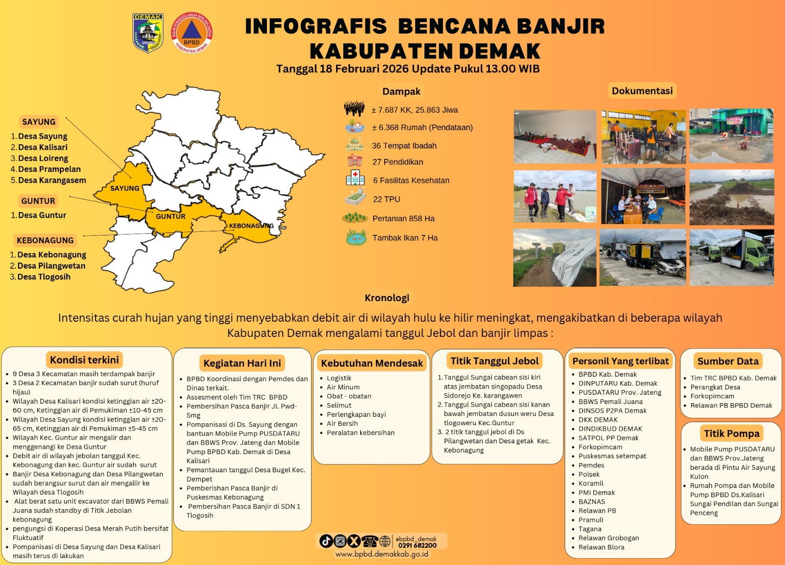 Debit air di wilayah hulu tanggul Kecamatan Kebonagung dan Kecamatan Guntur dilaporkan telah surut. Di Desa Kebonagung dan Desa Pilangwetan, kondisi banjir berangsur surut dan air mulai mengalir menuju wilayah Desa Tlogosih. Sementara itu, pompanisasi di Desa Sayung dan Desa Kalisari masih terus dilakukan guna mempercepat penurunan genangan.